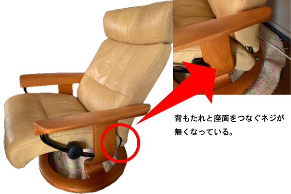背もたれと座面をつなぐ可動部のネジがなくなっており、連動した可動が出来なくなっていました。