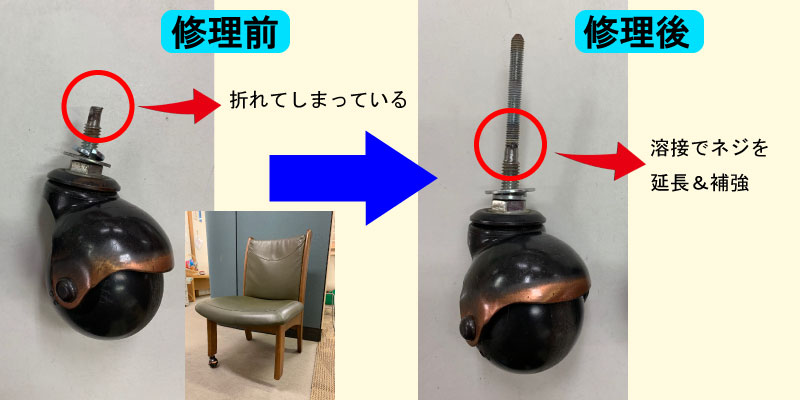 確認させていただくと、キャスターと椅子を連結するネジが折れていました。