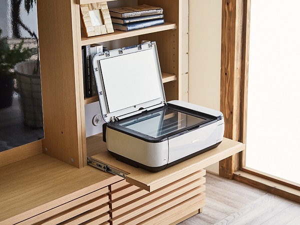 50マルチキャビネットには、プリンターを引き出して使えるスライド棚